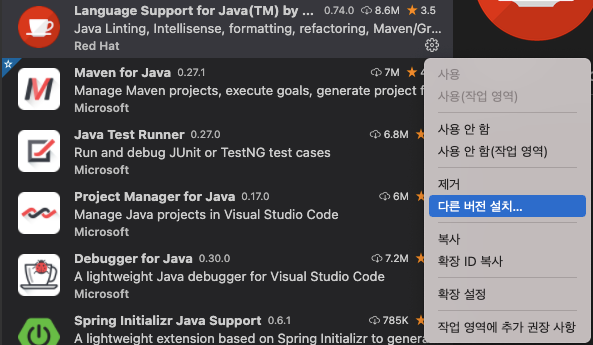 vscode의 확장:마켓플레이스 에서 해당 Java 확장팩을 설치할때나, 설치가 되어 있어도 위의 첨부 이미지처럼 원하는 다른 버전으로 설치를 할수가 있다.