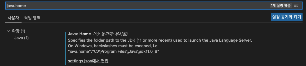 검색된 Java:Home 부분에 settings.json에서 편집을 선택해준다.