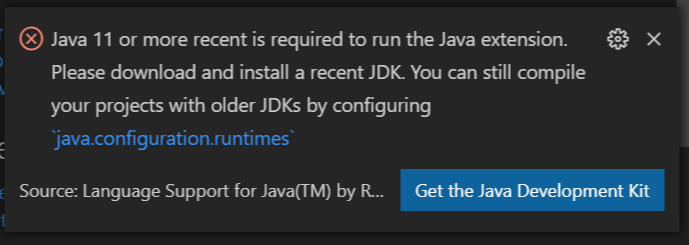 vscode의 java의 기본 확장팩인 Language Support for Java(TM) by Red Hat를 설치하여 사용하는데, 이게 최신버전의 경우 Java11 이상만 지원이 되도록 변경이 되었다.